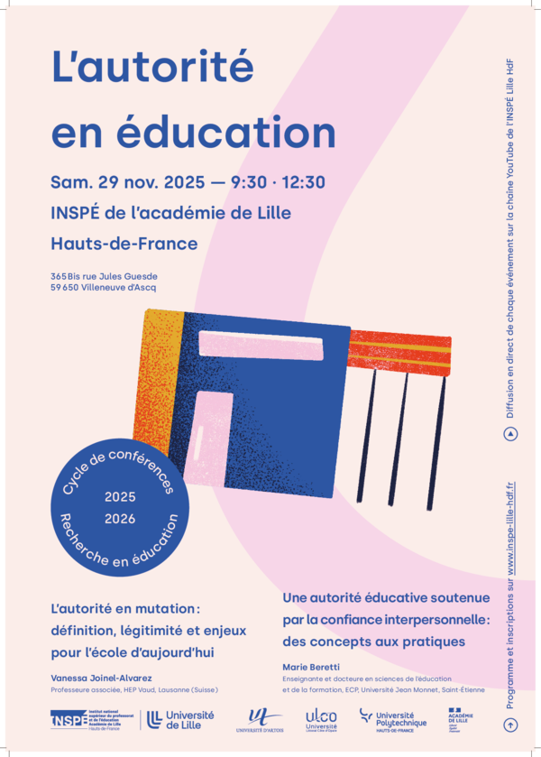 Dans le cadre du cycle de conférences 2025-2026, une conférence sur la thématique "L'établissement, le stage et le métier" est organisée le samedi 27 septembre 2025, de 9h30 à 12h30, sur le site INSPÉ de Villeneuve d'Ascq, amphithéâtre B.