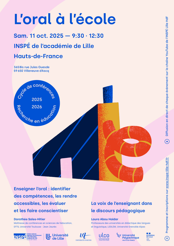 Dans le cadre du cycle de conférences 2025-2026, une conférence sur la thématique "L'oral à l'école" est organisée le samedi 11 octobre 2025, de 9h30 à 12h30, sur le site INSPÉ de Villeneuve d'Ascq, amphithéâtre B.