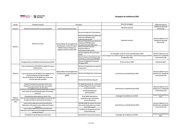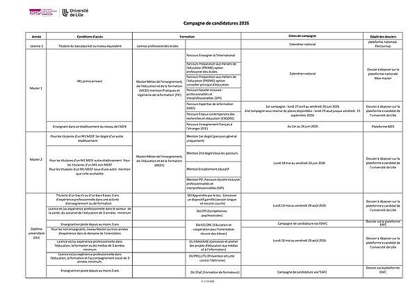 Parcours Enseigner à l'international Parcours Société inclusive : professionnalités et interprofessionnalités (SIPI) Parcours Préparation aux métiers de l'éducation (PREME) option professorat des écoles Parcours Préparation aux métiers de l'éducation (PREME) option conseiller principal d'éducation | Dépôt des candidatures : du 17 février au 16 mars 2026